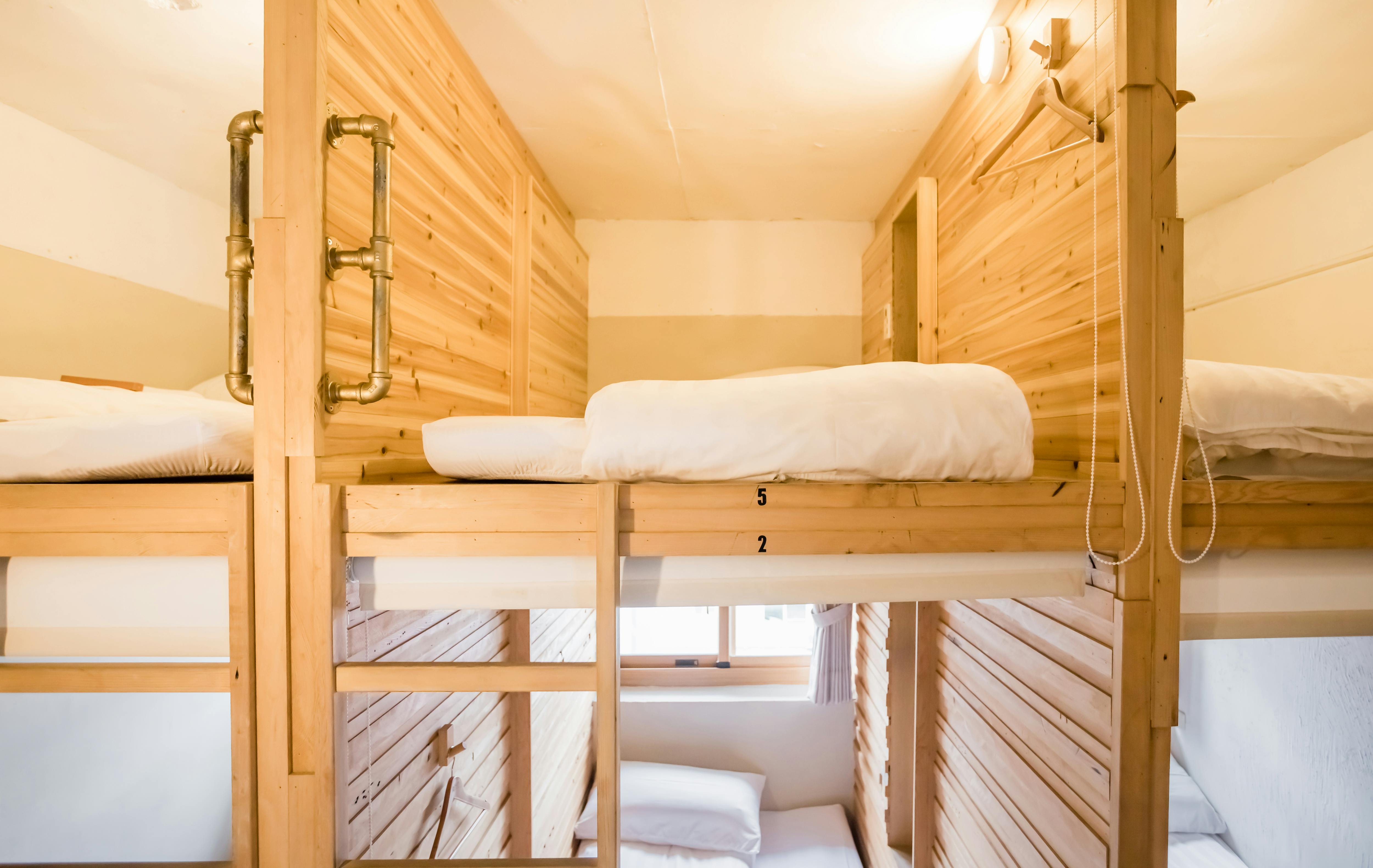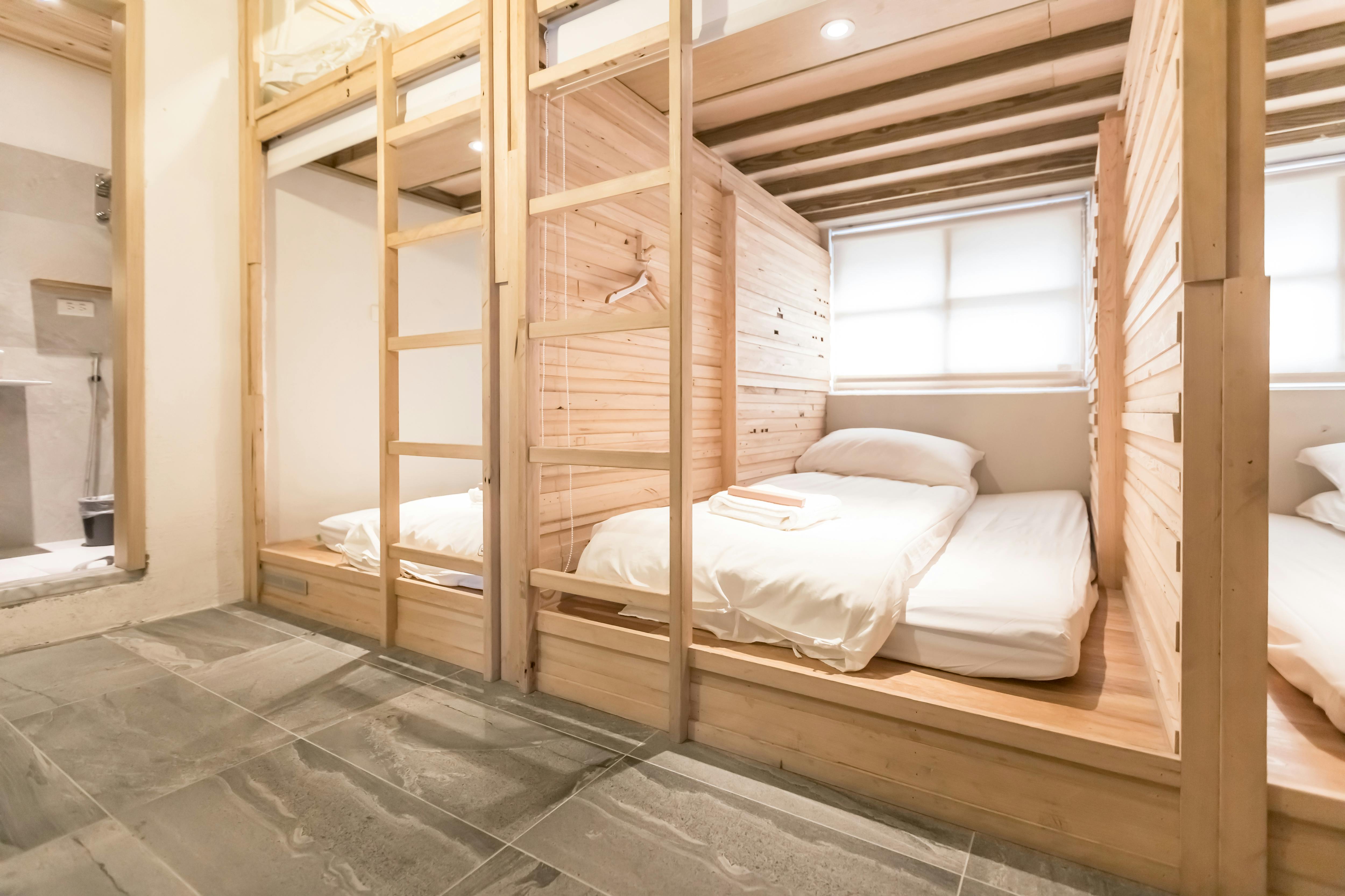 A 6 bed mixed dorm room, beds are made carefully by carpenter of the old wooden hinoki doors of the old hotel. You can smell the smell of Hinoki when you enter the room.